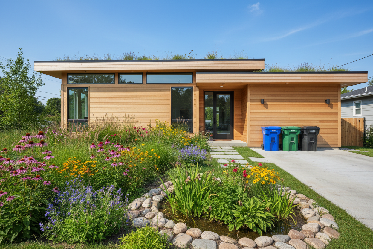 Eco‑forward rain water management and native plant landscapes.