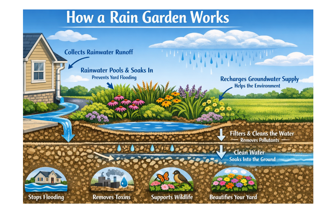 Rain gardens capture water where it falls, letting it slowly soak into the ground instead of rushing toward your foundation or the street.